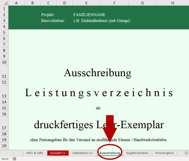 Im Arbeitsblatt Ausschreibung steckt das druckfertige Leerexemplar (ohne Preise) für den Versand an ausführende Baufirmen, Handwerksbetriebe oder Generalunternehmer.