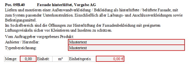 Eingabefeld ergänzende Positions-TexteBei den meisten Leistungsgruppen / Gewerken haben Sie als Auftraggeber (AG) die Möglichkeit, selbst bestimmte Produkte vorzugeben, die angeboten werden sollen.