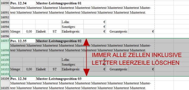 Achten Sie darauf, immer die gesamte Leistungsposition inklusive der letzten Leerzeile zu löschen. Markieren Sie dazu die zu löschenden Zeilen wie hier beispielhaft gezeigt: